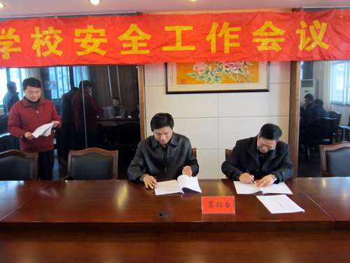会上,纪委书记吴健总结了2013年学校安全工作方面取得的成绩和存在薄弱环节,提出了2014年安全工作设想,并对下一步学校安全工作进行安排部署,并提出九点要求。一是继续实行安全工作责任追究制和风险抵押金制;二是加强安全知识教育,提高师生安全防范意识;三是强化对重点学生的教育,继续实施后进生“结对子”工程;四是强化治安安全防范;五是加强食堂管理;六是强化消防和用电安全管理;七是强化实训室、实习设备、工具的安全管理;八是针对性开展安全隐患整治工作;九是积极协调家庭、社会各方面力量做好学生教育管理和校园周边的治安工作。会上,校领导与各分管校领导、分管校领导与各部门负责人分别签订了2014年学校安全责任书。